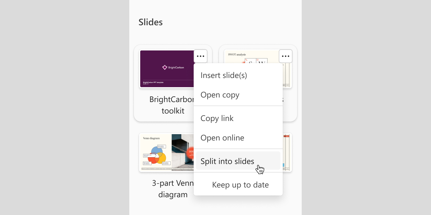 Slide libraries can contain multi-slide or single-slide PowerPoint files. The Split tool is an admin-level feature that allows you to quickly break apart PowerPoint presentations into single-slide assets. Each slide is saved as a separate file and is immediately available in your asset library.
